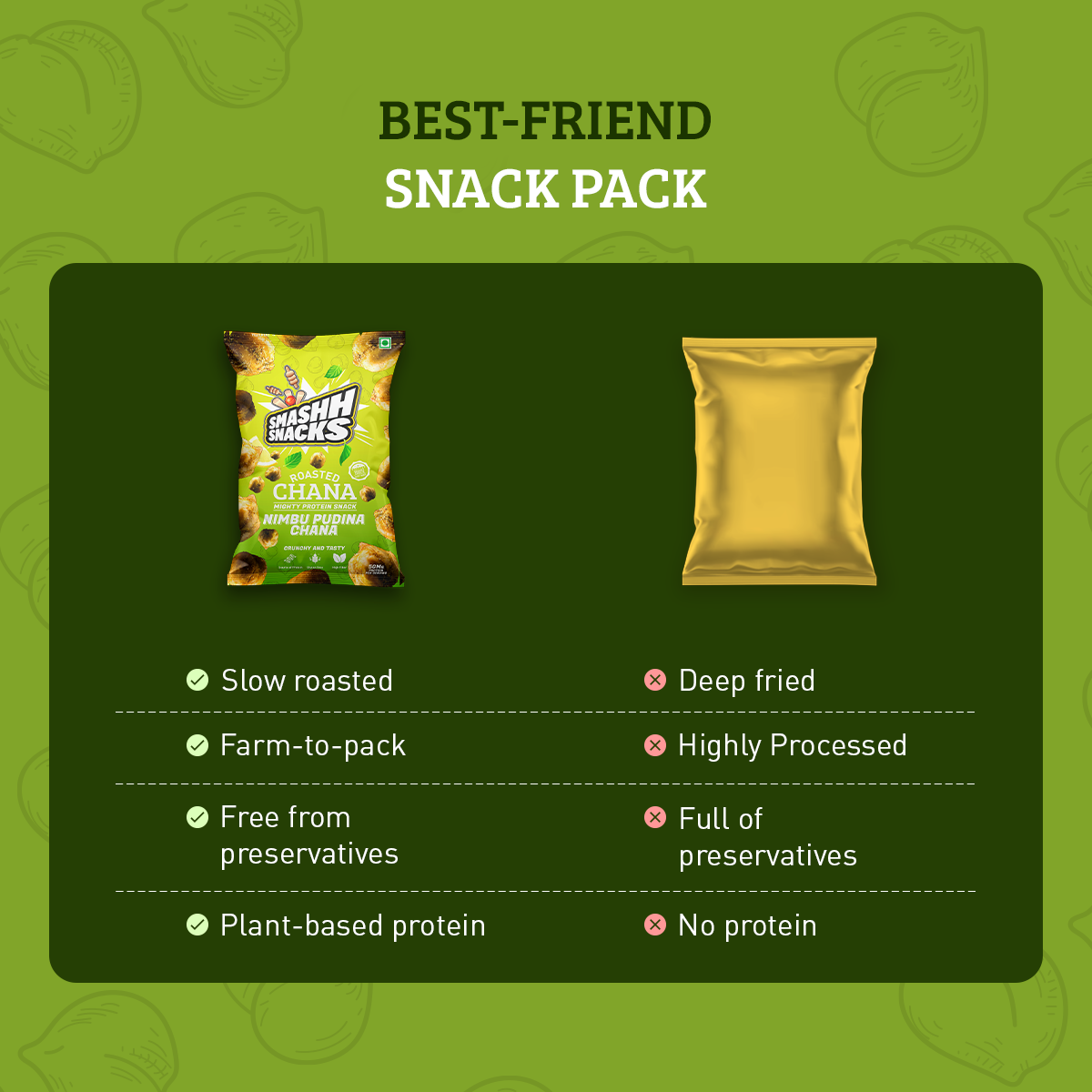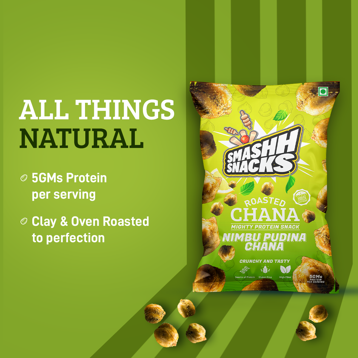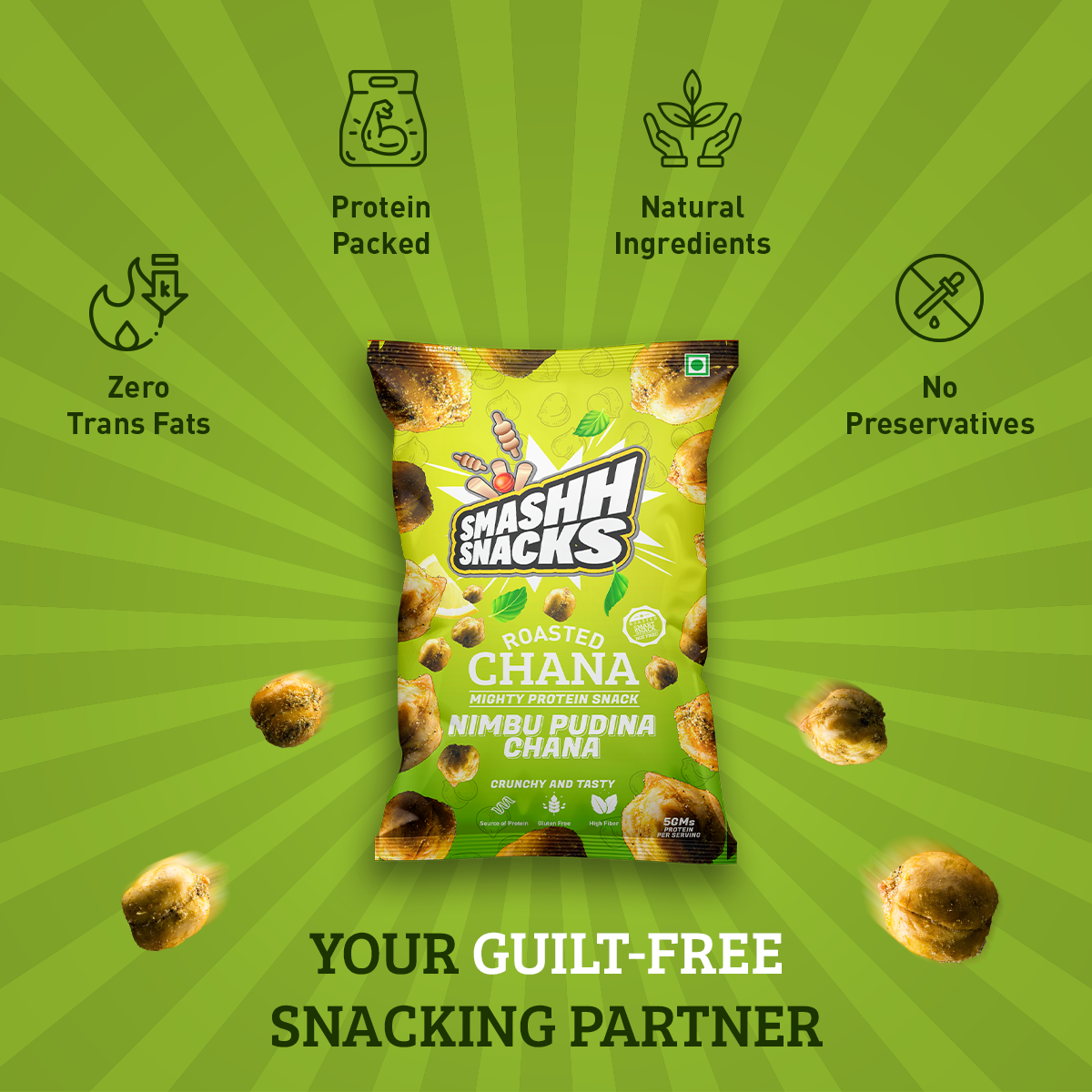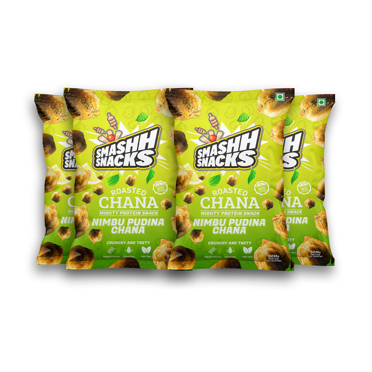 - High Protein Content: Each pack of Smashh Double Roasted Nimbu Pudina Chana contains 5 grams of protein, making it an excellent source of protein to fuel your day. This protein-packed snack is perfect for supporting your active lifestyle and keeping you feeling satisfied between meals.